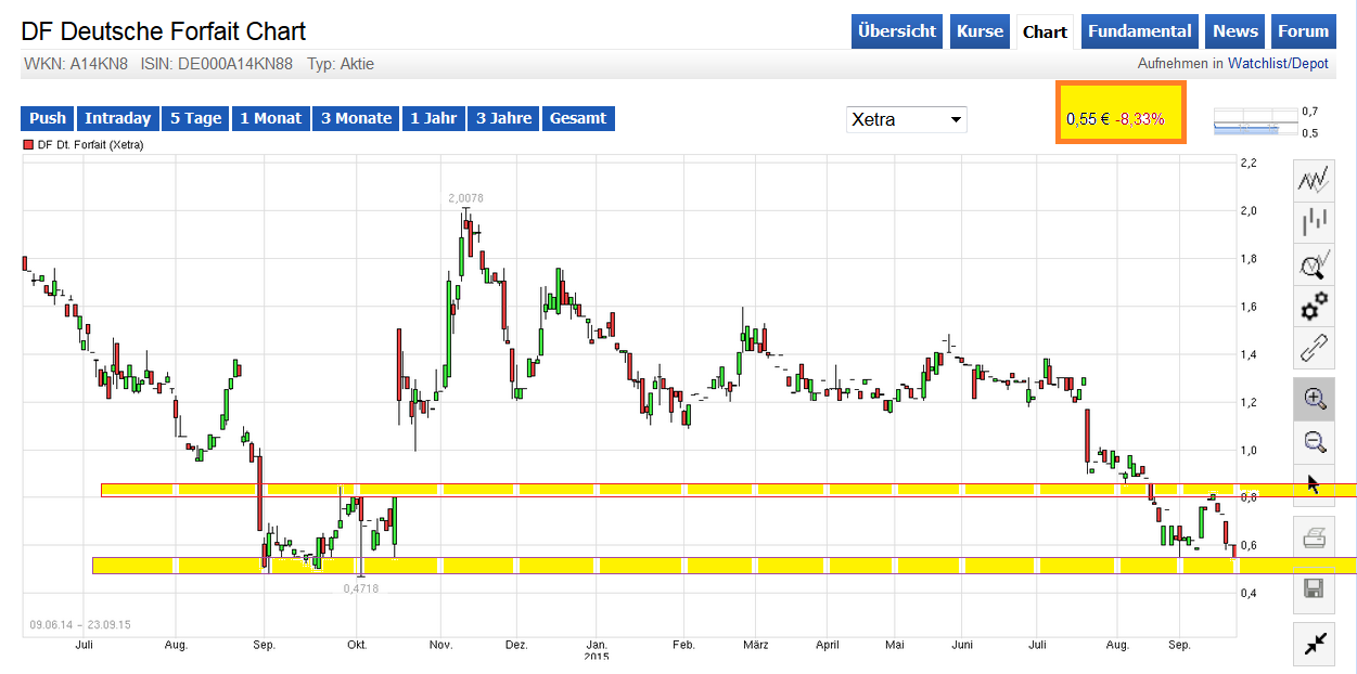 Köln, 23. September 2015 - Bei der am 12. Juni angekündigten Kapitalerhöhung gegen Bareinlagen mit Bezugsrechten der Aktionäre ("Barkapitalerhöhung") der DF Deutsche Forfait AG (Prime Standard, ISIN: DE000A14KN88) wurden insgesamt nur ca. 45% der angebotenen Aktien platziert. Per ad-hoc-Mitteilung vom 22. Juli 2015 hatte die Gesellschaft darauf hingewiesen, dass die Stärkung des Eigenkapitals damit um EUR 6,0 Mio. geringer ausgefallen ist, als im Rahmen des IDW S6-Gutachtens vorgesehen. Die Barkapitalerhöhung wird nur dann in das Handelsregister der Gesellschaft eingetragen und damit wirksam, sofern auch die Sachkapitalerhöhung ("Sachkapitalerhöhung") in das Handelsregister eingetragen wird. Die vorherige Eintragung der Sachkapitalerhöhung setzt indes eine Mindeststärkung des Eigenkapitals der Gesellschaft voraus, die im Rahmen der Barkapitalerhöhung erreicht werden sollte, aber nicht erreicht wurde. ..[...]