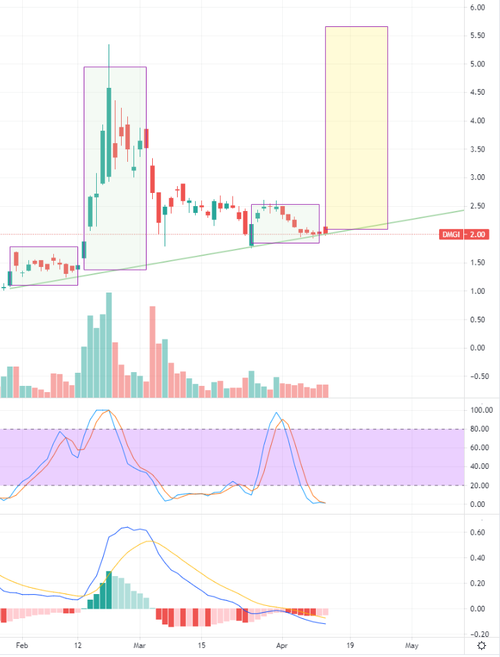 Ich hatte DMG bereits länger auf meiner Watchlist und bin letzte Woche mit einer kleinen Position rein. Das bisherige Bitcoin-Allzeithoch könnte uns hier aus meiner Sicht in den nächsten Woche einen ordentlichen Schub nach oben geben. Ich teile die Ansicht, dass DMG immer etwas Zeit braucht um aus den Startlöchern zu kommen. Wenn das gelingt, könnte es aber zu einem erneuten Kursfeuerwerk kommen.
