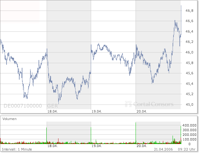 Aktie muss erst mal ein paar schlechte Nachrichtenverdauen. (Ölpreis, Tarifabschluss) Warte mit meinem Einstieg noch bis zu einem Kurs um die 44. Die Zahlen am 27.4. dürften aber wieder etwas Schwung verleihen