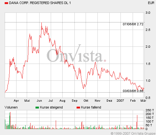 Diese Meldung könne der Aktie allerdings kaum noch was anhaben. So habe der Titel in den letzten Monaten schon das schlimmste überstanden. Von Kursen bei rund 14 USD im September 2005 sei es abwärts gegangen bis auf knapp 0,60 USD. Hintergrund sei eine stark negative Geschäftsentwicklung, welche schließlich dazu geführt habe, dass Dana zahlungsunfähig geworden sei. Der US-Konzern habe daher für sich und seine 40 US-Tochtergesellschaften den Gläubigerschutz nach Chapter 11 des US-Insolvenzrechts beantragt. Laut Dana sei dabei ein Gemeinschuldner-Kredit in Höhe von 1,45 Mrd. USD vereinbart worden, der den Weiterbetrieb sicherstellen solle. Damit würden die zwei Kreditlinien von 400 Mio. USD bzw. 275 Mio. USD abgelöst.
