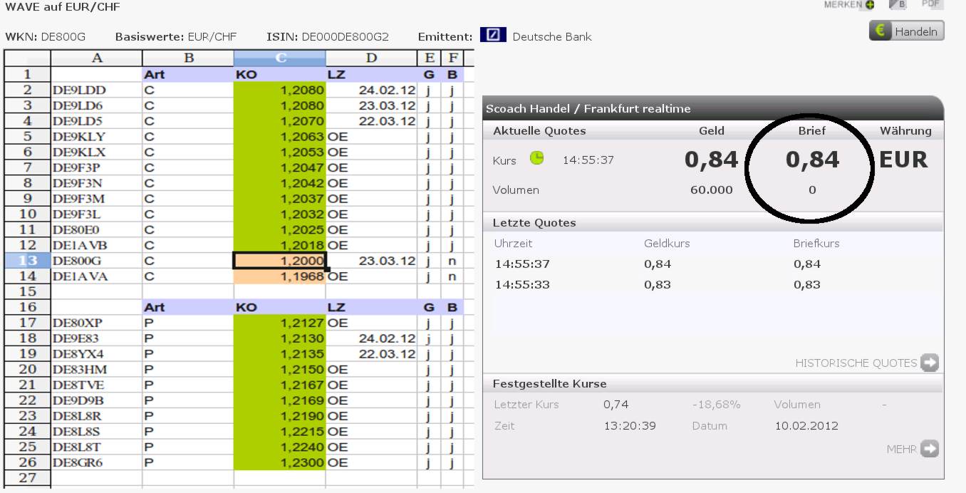 Und da dachte ich mir so: "Die DEUBA hat bestimmt ein besseres Risikomanagement als die vielen Trader da draußen" und habe die KOs im Bereich EURCHF mal untersucht.