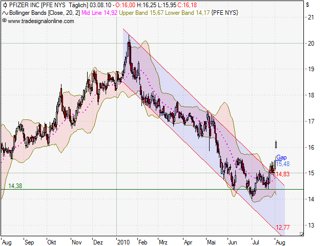 Jawoll, Zahlen sind super :), jetzt kanns dann wohl nachhaltig mal wieder steigen, nach dieser langen Abwärtsbewegung. Fundamental sieht es zumindest jetzt super aus, keine Frage. Und auch charttechnisch sieht es besser aus, zumindest mittelfristig. Kurzfristig wird es wohl runter gehen. Die Bollingerbänder wurden durchdrungen, ein Gap bildete sich heute (Kurs müsste um es zu schließen auf 15,48$ zurück), der RSI deutet nun auf Überkauft hin, Der Stochastik Slow notiert ebenfalls auf einem sehr hohen Niveau. Ein Rücksetzer auf ca. 15,48$ ist sehr wahrscheinlich, Mittefristig sollte jedoch die Richtung nun klar sein. Der Boden scheint gefunden zu sein, denn der Mittelfristige Abwärtstrend wurde nach oben aufgelöst.