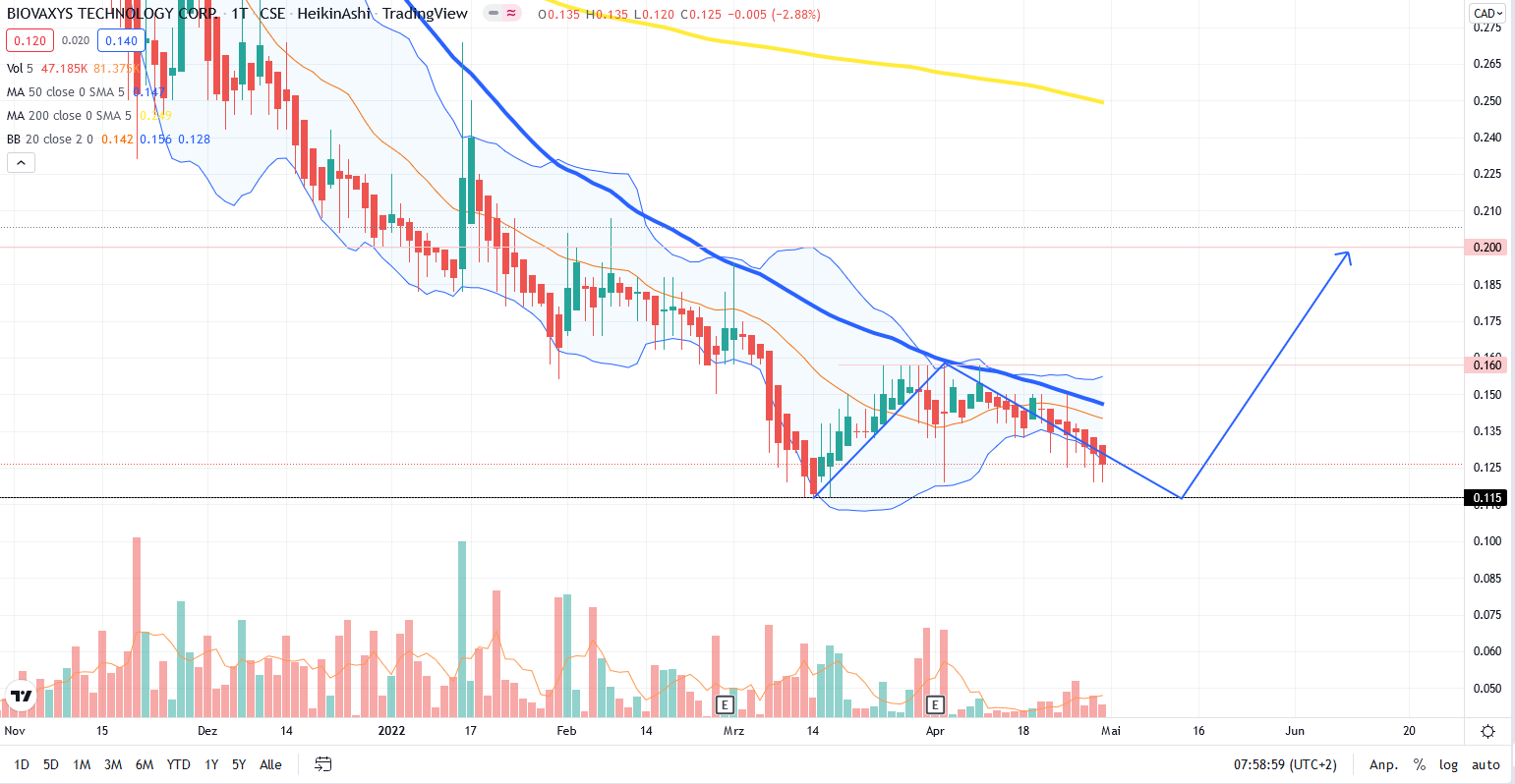 Biovaxys scheint etwas aus dem Winterschlaf zu kommen, leider sind die Neuigkeiten bisher eher enttäuschend. Charttechnisch halten wir uns aber trotz all der Wirren in der Welt recht gut, wahrscheinlich werden wir aber zeitnah noch einmal das Tief bei 0,115 CAD sehen. Ich hoffe auf einen doppelten Boden und eine folgende Trendumkehr. Schönes Wochenende!