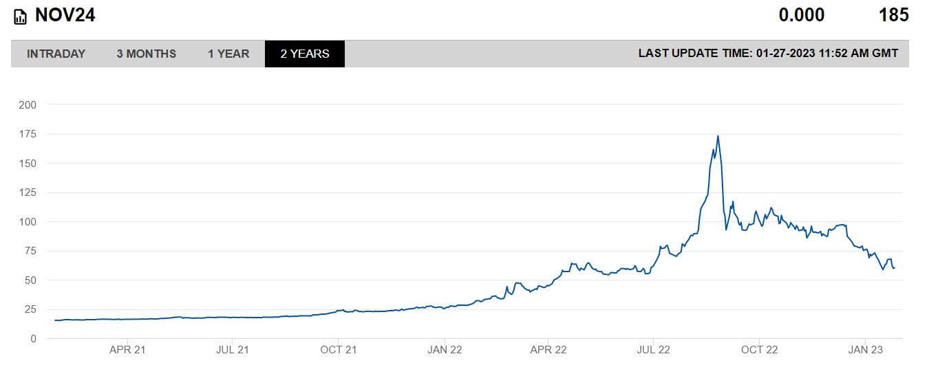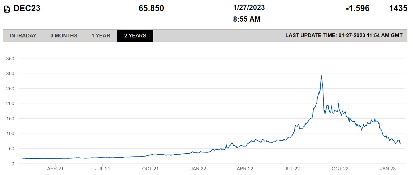 Dass die Preise nach dem Habeck-Blödmann-Top im Herbst 2022 ("Ich kaufe alles verfügbare Gas, egal wie teuer es ist") deutlich gefallen sind, ist eine angemessene Korrektur, aber noch längst keine Kehrtwende.