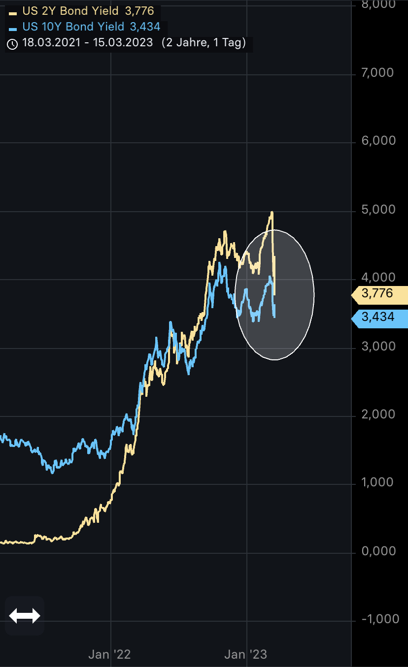 Unten im Chart sieht man genau dies: Die Renditen der 2-jährigen (orange) sind mit 4,5 % höher sind als die die 10-jährigen (blau) (3,7 %). Damit ist die Zinskurve invertiert, was als Vorzeichen einer Rezession gilt: