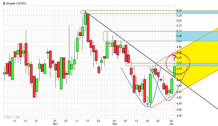 Charttechnischer Ausblick: Die Aktie von Jenoptik dürfte nach dem missglückten Rallyversuch nun einigen Tage unter Verkaufsdruck stehen. Abgaben gen 4,70 sind kurzfristig zu erwarten. Mittelfristig droht sogar ein Rückfall in Richtung 3,85 Euro.