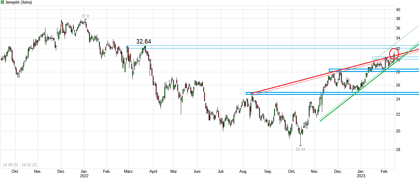 Das ist ja erfreulich was heute gemeldet wurde, insbesondere in Bezug auf die 23er Prognose. Wichtig ist neben dem durch den starken Auftragsbestand angekurbelte Umsatzwachstum eben auch, daß die Marge ebenfalls weiter steigt. Das ist laut Prognose der Fall. Von daher sollte das den Kurs stützen. Auf der anderen Seite ist der Jenoptik-Kurs in den letzten 4 Monaten schon um über 50% angestiegen. Das dürfte sicherlich nicht geschehen sein, weil man ungünstige Entwicklungen erwartet hat, sondern weil man eben schon früh wieder auf eine Erholung in 2023 gewettet hat. Entsprechend ist die Frage wieviel von dem heute Gesagten noch nicht hinreichend im Kurs eingepreist ist. Nächster Widerstand läge bei 32,64. Ist ja nicht so weit entfernt. Mal schauen, ob man gewillt ist mit den heutigen Zahlen im Rücken die nächsten Tage dort oben man anzukopfen und um Durchlaß zu bitten ;)