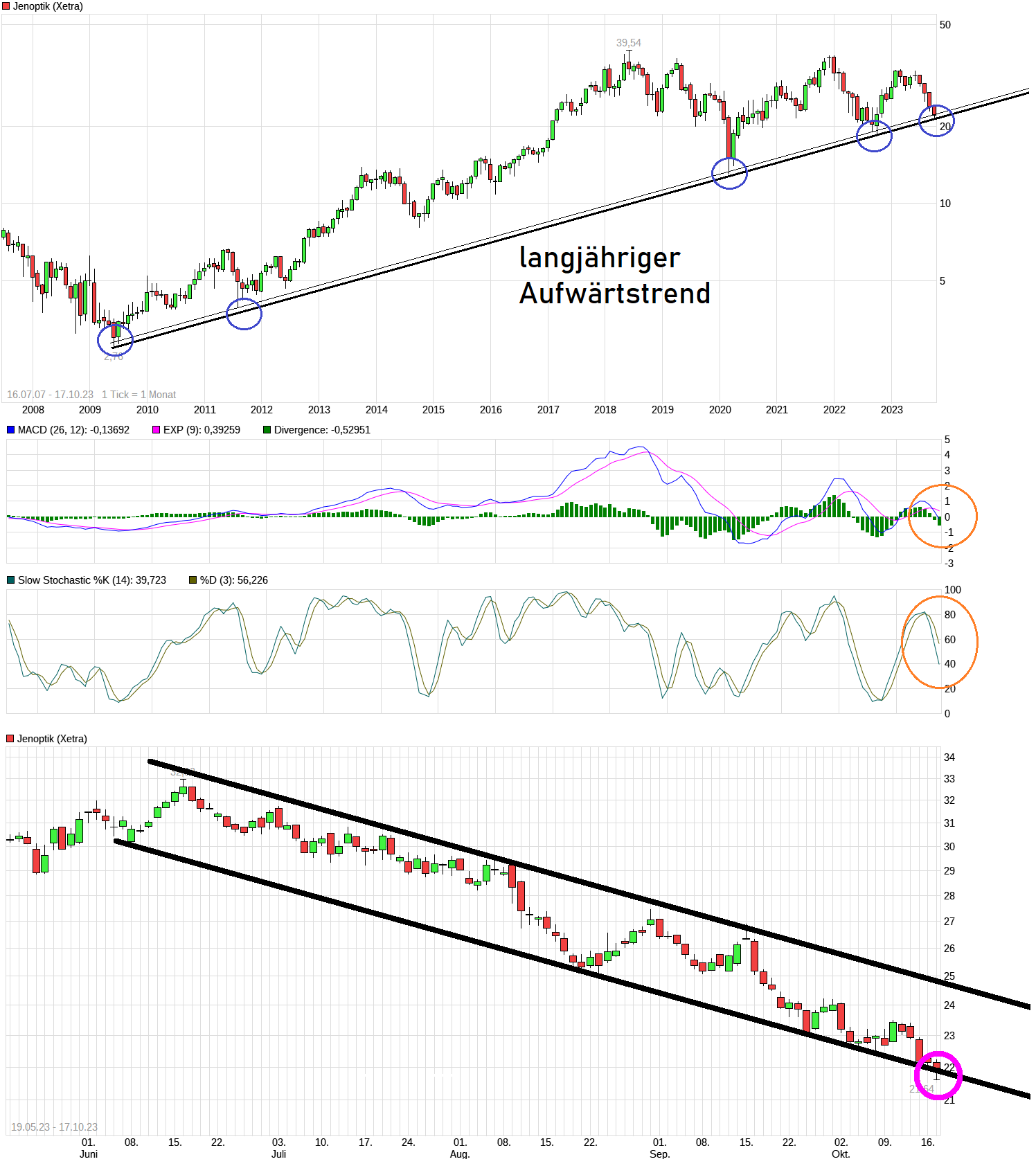 schon sehr stark diese Abwärtsdynamik der letzten Wochen. Heute ist man sogar zwischenzeitlich nach unten aus dem Abw.trendkanal gelaufen in dem sich der Wert seit Juni befindet. Damit kommt man auch dem langjährigen Aufwärtstrend wieder sehr nahe. Hoffentlich kann der den Downmove mal einbremsen. Ist die Frage was den Kurs so stetig nach unten treibt. Die gegenwärtige Situation bei Jenoptik? Die perspektivische der kommenden Quartale? Oder in erster Linie "Sippenhaft" mit dem ganzen Branchensektor plus zusätzlich jüngste Friktionen um mögliche Handelsrestriktionen gegenüber China bei gewissen Technologien und mögliche "Vergeltungsmaßnahmen"? Also mal abwarten was bei den kommenden Q.3 Zahlen zu all diesen Dingen gesagt werden wird und ob der Markt im Vorfeld nicht zu sehr nach unten inzwischen übertreibt.