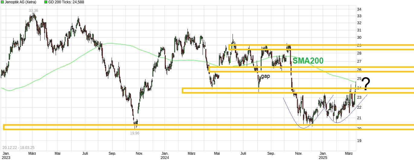 Also mal schauen, ob man es jetzt doch schafft die Region um 23,30/50 nachhaltig zu verlassen. DAX ist heute auf neues Allzeithoch gelaufen, seit der Wahl von Trump ist der DAX um 4500 Punkte gestiegen und seit der Wahl von Merz hängen europäische Aktien die US Aktien ab. In so einem Umfeld ist es auch für Jenoptik vielleicht einfacher etwas Boden wieder gutzumachen. Und dann einfach mal schauen was bei den nächsten Zahlen für ein Prognose-Update kommt. Vielleicht kann ja Jenoptik versuchen wieder eine neue Sparte für Rüstung aufzubauen. Optische Geräte und Hightech wird man militärisch immer weiter brauchen. Wäre doch nett, wenn bei der Veröffentlichung der nächsten Q. Zahlen das so ganz beiläufig auch mal in den Raum gestellt würde ;)