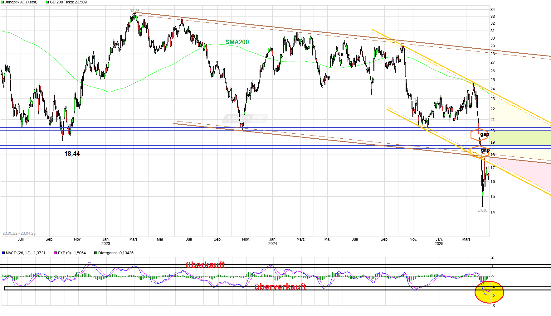 Könnte jetzt vielleicht doch etwas technische Erholung einsetzen nach diesem übertriebenen, fast hysterischen Abverkauf der Vorwochen? Man schaue nur wie weit man inzwischen auch von der SMA200 entfernt ist. Der MACD hat im extrem überverkauften Bereich nach oben gekreuzt und damit ein Kaufsignal erzeugt. Bin wieder mit im Boot und hoffe es geht jetzt vielleicht zumindest in Richtung 18,50/20€, wo wieder gewisse alte Widerstände liegen. Der Kurs ist ja alleine durch die Geopolitik nach unten gezogen worden und natürlich auch durch zuletzt angepaßte Zukunftsprognosen von Großkunden wie ASML. Da könnte der Vorstand täglich Aktien kaufen wie blöde, dies alleine würde nichts am Kurs sonderlich ändern. Ändern könnte nur perspektivisch eine Besserung/Abmilderung bei den Zöllen, speziell gegenüber Ländern in Südostasien und da besonders China.