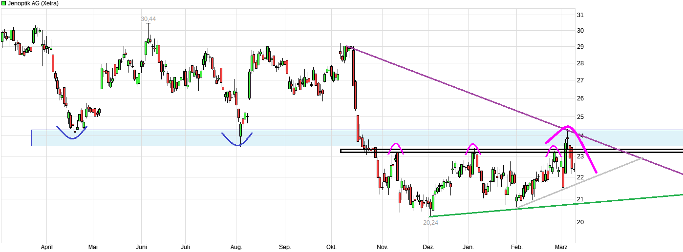 Im Jenoptik-Chart hat man jetzt möglicherweise ein Doppelboden bzw. eine W-Formation ausgebildet. Dafür müßte man aber möglichst weiter über dem Bereich um 23,30/40 bleiben. Problem ist natürlich, daß knapp darüber auch schon wieder die nächste horizontale Widerstandszone knapp unter 24€ liegt. Man steckt daher momentan etwas zwischen Baum und Borke. Da bin ich mal gespannt, ob dieser Ausbruch nach oben jetzt wirklich gelingen kann. Könnte man als spekulativen Trade wagen mit entsprechend enger Absicherung. Dann wäre der nächste Widerstand darüber knapp unter 26€ und darüber wäre dann auch schon bald die Abw.trendlinie zu sehen, die seit Anfang 2023 läuft und z.Z. bei ca. 28€ liegt.