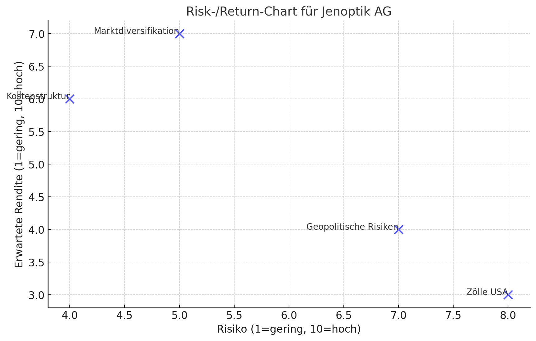 Hier ist das Risk-/Return-Chart für die Jenoptik AG, das die verschiedenen Risiken und potenziellen Renditen veranschaulicht: