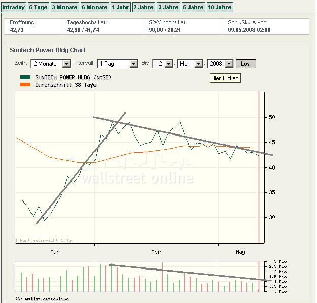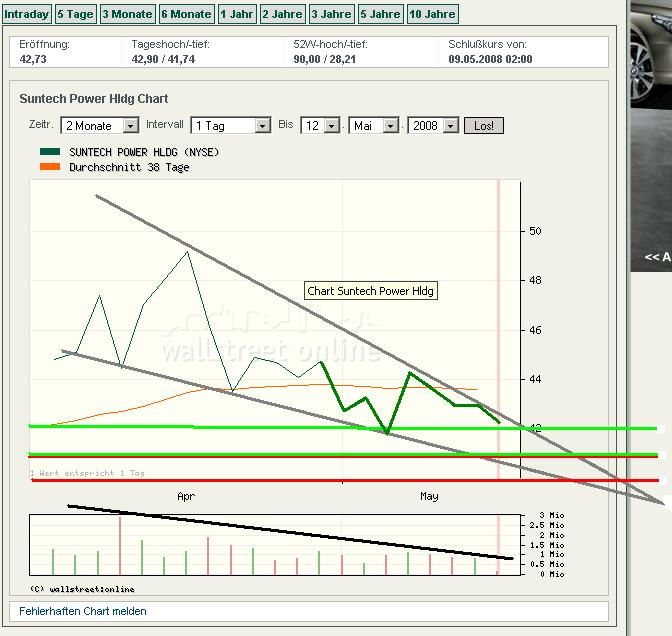 kein Thema! ;o) Das deutliche Signal wird tatsächlich vermutlich erst am 22.05. kommen. Aber warten wir mal ab, was die nächsten Tage passiert! Der Kurs hat die Formation noch nicht verlassen, sondern eher noch bestätigt... Ausserdem ist diese Perspektive ohnehin ja höchstens mittelfristig - in einem halben Jahr sehr ich Suntech, wenn es keinen allgemeinen Crash gibt, bei mind. 30% mehr!