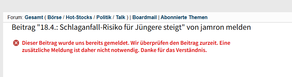Unsere bekannten Melderchens sind mal wieder nicht ausgelastet und betätigen sich anonym in der ariva'ischen Dunkelkammer. Es ist doch auch jetzt eine Bestätigung, dass von Seiten Ariva gar nicht gemeldet wird, sondern nur durch diese Meldefunktionsdrücker.