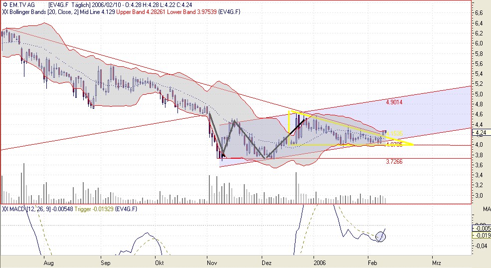 Nach der Bodenbildung wurde nun das Dreieck zusammen mit dem seit Juli 2005 anhaltenden Abwärtstrend nach oben durchbrochen. MACD liefert Kaufsignal, gute News sind im Anmarsch. Sieht nach einem optimalen Einstiegszeitpunkt aus, gelle? Macht was draus!