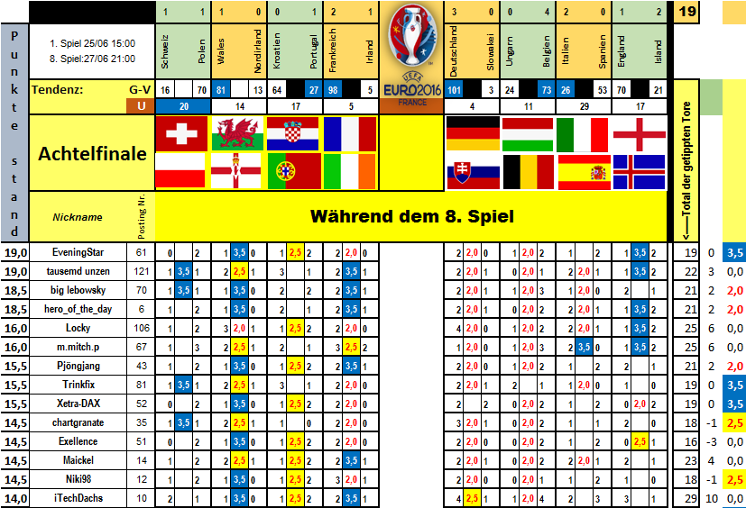 Weiter geht es nun mit dem Achtelfinale - das Achtelfinale läuft vom 25.06. bis zum 27.06. 2016!