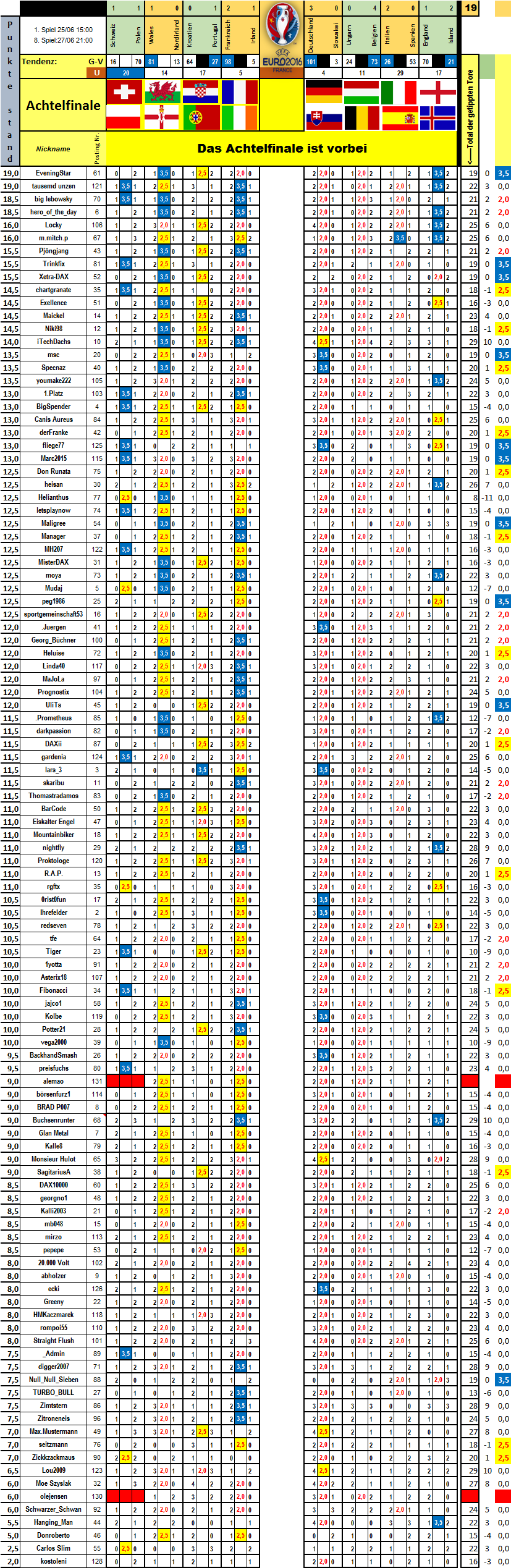 28 Punkte bleiben zu vergeben, also absolute Spannung ist angesagt. Was die Zusatzpunkte anbetrifft möchte ich aber auch noch auf "msc" eingehen, der bisher 3 Mal die korrekte Anzahl der Tore pro Runde getippt hat. Einmal musste er auf die Punkte in dieser Wertung verzichten, weil er etwas zu spät getippt hatte (10 Spiele)