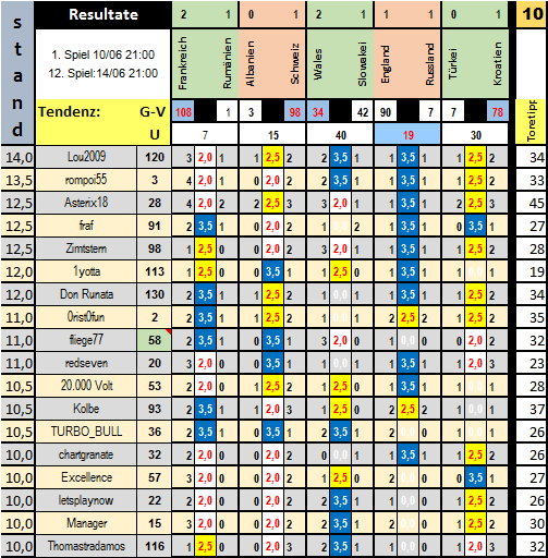 * Betreffend # 143: Im Spiel Türkei-Kroatien hatten 79 User den Sieger des Spiels richtig bestimmt. Der Korrektur bin ich hiermit nachgekommen. Wie gesagt hatte keinen Einfluss auf die Tabellenplätze.