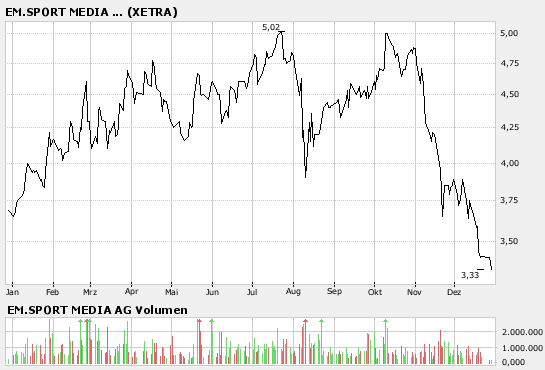 ich weiß ja nicht wie lange Du schon in EM.Sport Media investiert bist, aber eine so lange Haltedauer habe ich nur bei wenigen Aktien! Ich hatte damit gerechnet in diesem Zeitraum mit Gewinnen die Aktie abzustossen, bevor die nächste Rezession vor der Tür steht!