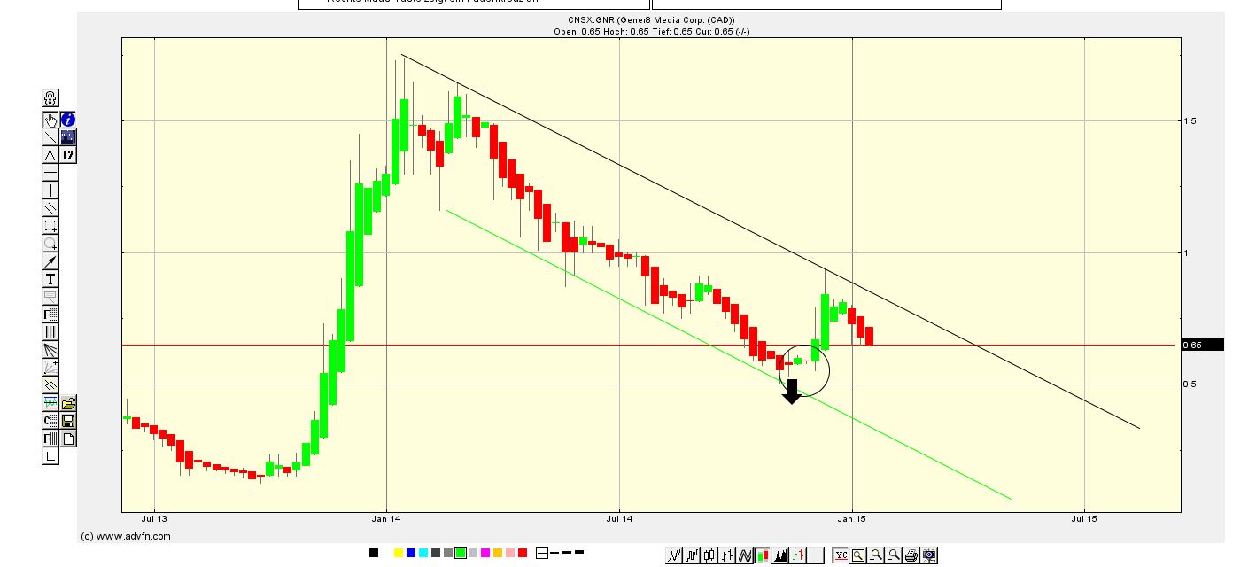 Auch wenn einige der Meinung sind, dass man diesen Wert anhand der möglichen hohen Volatilität nicht mit Charttechnik beurteilen kann, so finde ich es dennoch sehr bemerkenswert das wir hier ein sehr gutes und ausgeprägtes Chartbild erkennen könne. Nämlich nach unten. Der Zeitpunkt von A.M., kurz vor Ende des Jahres 2014 nochmals eine mögliche Vertrauensvolle und Hoffnung machende Mitteilung über Gener8 ist doch kein Zufall. Hier kann man sehr gut erkennen, dass wenn es keine Neuigkeiten gegeben hätte, der Kurs nach unten abgerutscht wäre. Und die Masse hätte 100 pro ihre Anteile geschmissen.