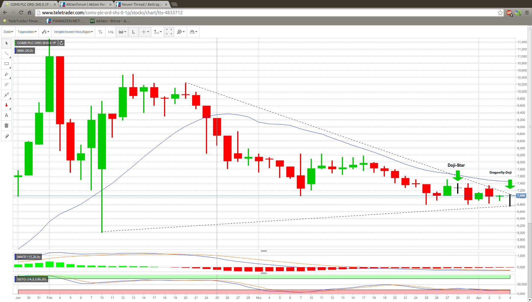 Und so sieht der Chart momentan aus, durch die Bildung von einem Star-Doji und einem Dragonfly-Doji, sieht es nun wieder besser aus, ersteres war nichtig, da die Indikatoren nicht übereinstimmten. Letzteres hingegen signalisiert einen Trendwechsel, die Indikatoren signalisieren und bestätigen dies, zudem ist der absteinender Keil ein weiteres Indiz dafür, dass es hier bald so richtig losgeht, wird dieser verlassen, wird der Aufstieg schnell von statten gehen, das erste Kursziel ist vornehmlich bei 8,9 GBX zu finden, dies dürfte nur der Anfang sein, da COMS PLC bald plant in den USA Fuß zu fassen.