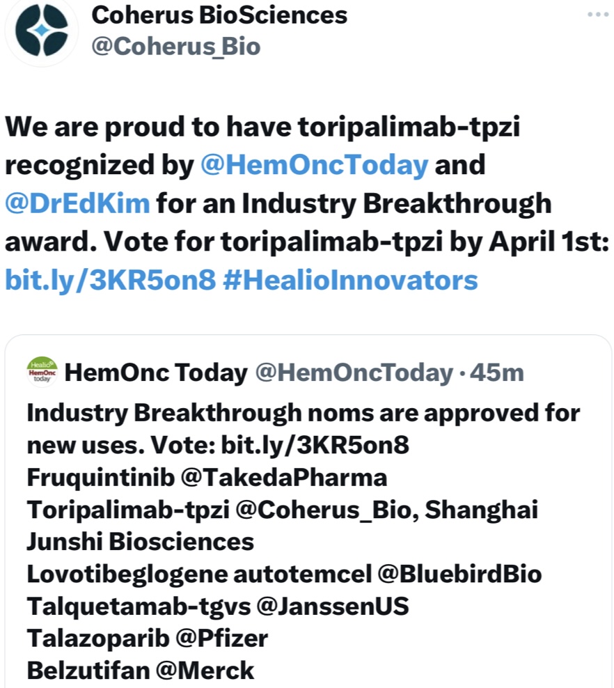 Auszeichnung. Stimmen Sie bis zum 1. April für toripalimab-tpzi: