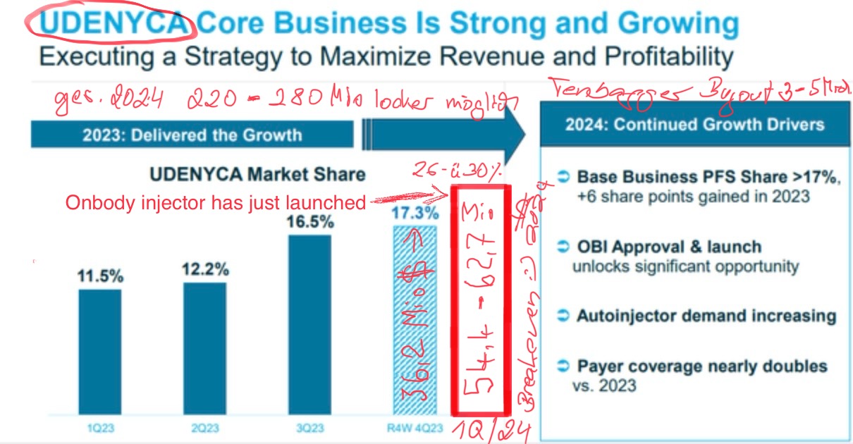 Wenn ein Marktanteil von 17,3% im Q4'23 Nettoumsatz von Udenyca von 36,2 Millionen Dollar ergab, ist es möglich, dass ein Wachstum des Marktanteils um 50 % auf 26 % einen Umsatz von 54,4 Mio. USD erzielen könnte, und das ist mit der Einführung des Onbody-Formulars erst im Februar. Wenn CHRS kein weiteres Wachstum verzeichnen würde, würde das allein im Jahr 2024 217,6 Millionen Dollar einbringen. Die Idee, dass sich der Nettoumsatz von Udenyca im Jahr 2024 verdoppeln könnte, anstatt nur um 50 % zu erhöhen, wie sich die Marktanteilszahlen widerspiegeln, ist ebenfalls möglich, aber das ist etwas optimistischer.