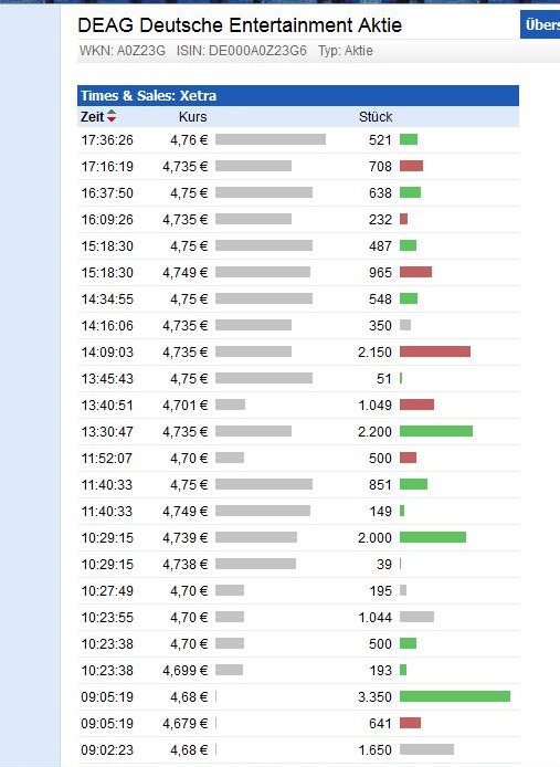 in die beiden großen Transaktionen nicht viel hineininterpretieren. Wenn jemand Aktien kaufen will, dann kann er das doch tun. Den ganzen Tag lang. Warum also plötzlich eine so große Transaktion und dann wieder tagelang kaum Umsatz (bei geringeren Kursen)?