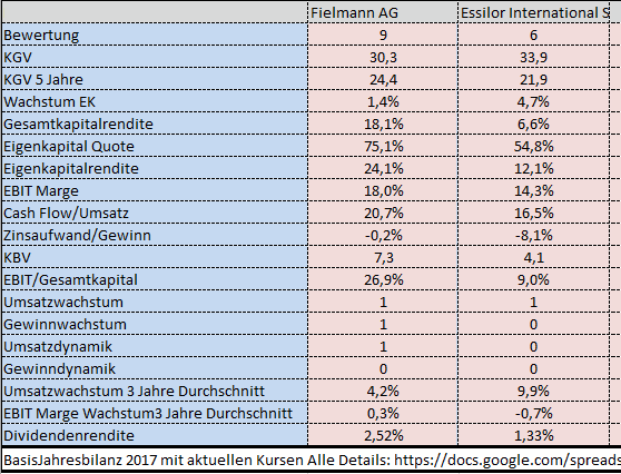 Vergleich man die angehängte Bilanz sind keine großen Unterschiede zu erkennen. Fielmann kann mit dem Equity und der Kapitalrendite glänzen. Essilor ist etwas besser beim Wachstum. Fundamental gesehen würde man beide Aktien ins Depot aufnehmen können.