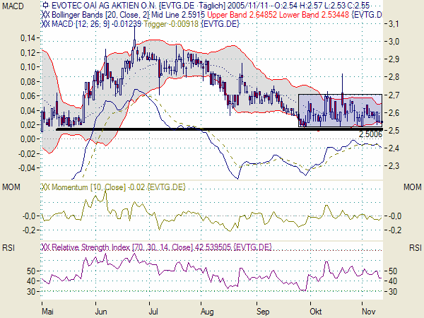 ein fallendes Dreieck. Für mich ist das "Risiko" eines Absurzes unter die 2,5 wesentlich höher als das Evotec sich mittelfristig wieder berappelt. Zumindest charttechnisch!