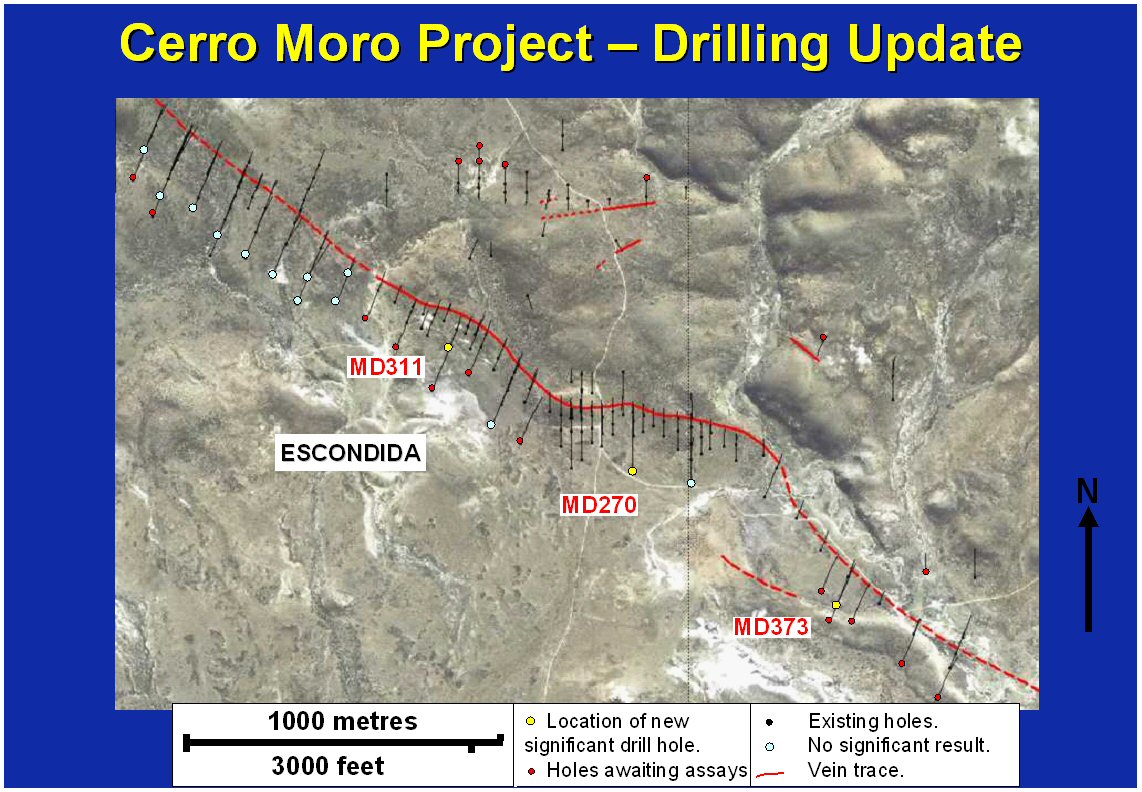 Bei Cerro Moro konzentrie­ren wir unsere Exploratio­n ausschließ­lich auf den Erzgang Escondida,­ insbesonde­re auf Erweiterun­g der Zonen mit einem Goldäquiva­lentgehalt­* von 12 bis 18 Gramm pro Tonne in abbauwürdi­gen Mächtigkei­ten mithilfe von Bohrschnit­ten. Die Ergebnisse­ der Bohrungen sollen die Grundlage für eine mit der Vorschrift­ NI 43-101 kompatible­ Ressourcen­schätzung bilden, die während des 2. Quartals 2009 abgeschlos­sen sein dürfte.