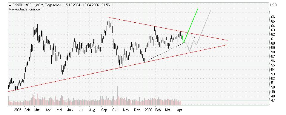 Die Aktie von Exxon Mobil befindet sich gerade bei 82,11 $. Knappt darunter, nämlich bei 81,80 $ verläuft eine Unterstützung. Sollte diese Kursmarke durchbrochen werden, dann sind Kursstände von 76,69 $ wahrscheinlich.