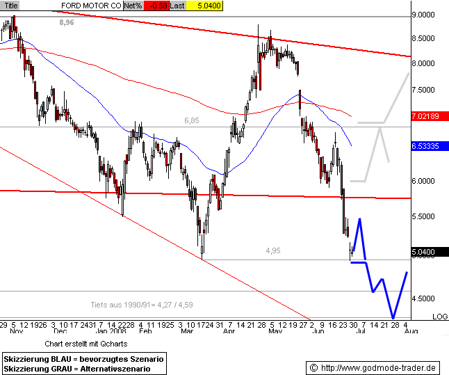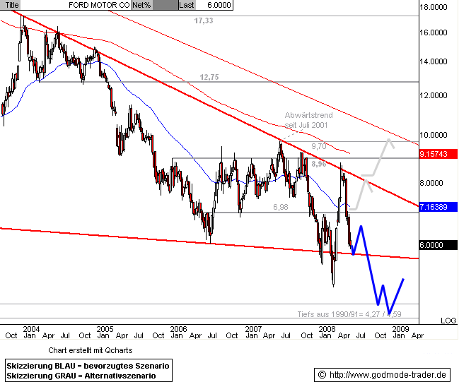 Charttechnischer Ausblick: Der heftige Abverkauf der letzten Wochen lässt die Chance auf eine größere Kurserholung der FORD Aktie nun deutlich sinken. Zwar wären vom Bereich bei 5,70 - 5,80 $ nochmals eine kleine Kurserholung auf den jüngsten Rutsch möglich, doch ist das Erholungspotenzial zunächst bis auf 6,98 - 7,16 $ beschränkt. Erst ein Anstieg über 7,16 $ per Wochenschluss würde einen erneuten Anlauf auf die langfristige Abwärtstrendlinie bei ca. 8,00 $ ermöglichen.