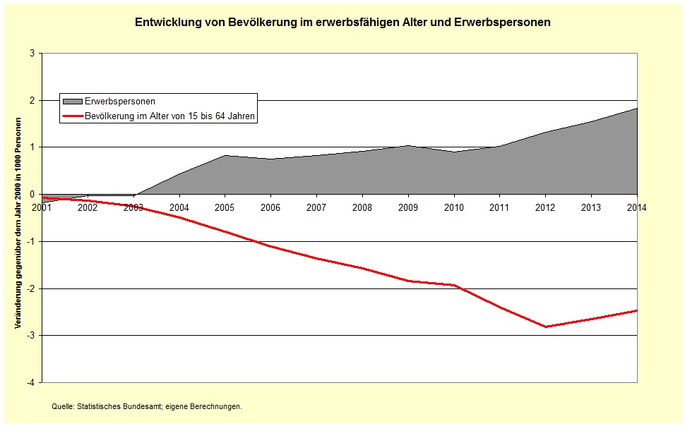 neigen zu einem ausgesprochen mechanistischen Denken - nach dem Motto: weniger Bevölkerung = weniger Leute auf dem Arbeitsmarkt. Ist aber ganz und gar nicht so - jedenfalls war die Realität anders:
