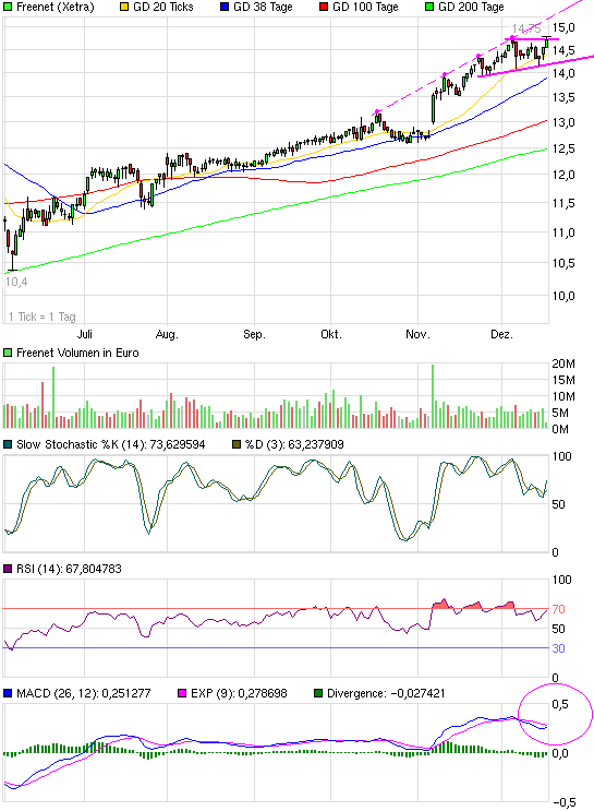 Der langfristig sinkende RSI verdonnert Freenet eigentlich zum Absturz. Mal sehen was es auslöst. Ich tippe darauf, dass die Stop-Buys über 15 abgefischt werden und es dann "Gute Nacht" heißt. Vorerst. Die Parabel ist noch nicht am Wendepunkt. Sicher nicht so kurz vor 15.