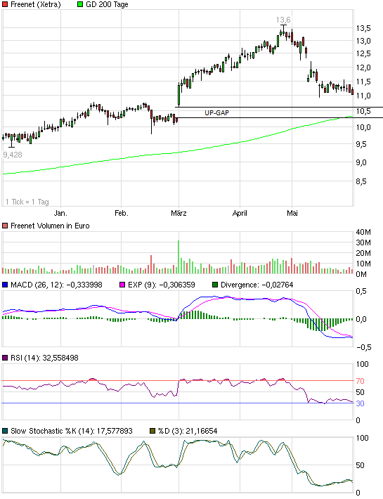 Also ich habe mal eine Abstauberorder bei 10,30 reingelegt, weil dann das noch offene Gap vom 1. März geschlossen wäre. Wenn ich sehe wie der freenet Kurs in den letzten Tagen eher zäh nachgibt während der Gesamtmarkt und andere Werte deutlich mehr taumeln, dann möchte ich lieber nicht wissen wo der DAX steht, wenn ich bei 10,30 bedient werden sollte.