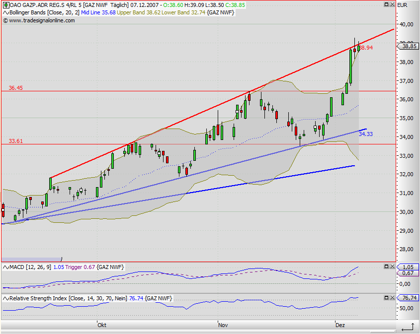 betrachtet man den Monatschart von Gazprom, sieht man, dass die Bollinger Bänder sich stark verengt hatten und nun eine dynamische Aufwärtsbewegung gestartet wurde nach einer längeren Seitwärtsbewegung seit 2006.