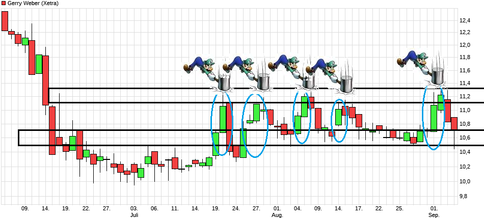 Im Bereich 11,20/30 wird nach raschen, newslosen Anstiegen dann nach 1-2 Tagen wieder der Hammer rausgeholt, um hier möglichst keine nachhaltige Kaufsignale zu erzeugen. Riecht wie gesagt etwas nach LV, die gewisse Eindeckungen in Salamiescheibenform vornehmen. Echte Investoren sind offenbar weiterhin nur mit der Lupe zu suchen.