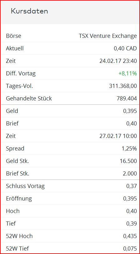 Hier auf ariva ( gute bohrergebnisse aus Kanada ), neues Interview mit Wolf wiese ist doch sehr positiv. Herr wiese macht wirklich einen guten, soliden, aber auch bescheidenen Eindruck. Bin überzeugt von ihm und dem Unternehmen. Wer Zeit hat, kann hier viel Geld machen ! LG bluebyyou