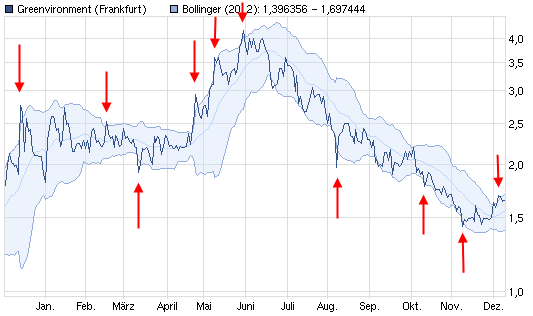 Bricht der Kurs aus dem Bollinger Band (rote Pfeile) kommt er immer wieder zurück.