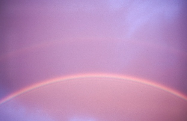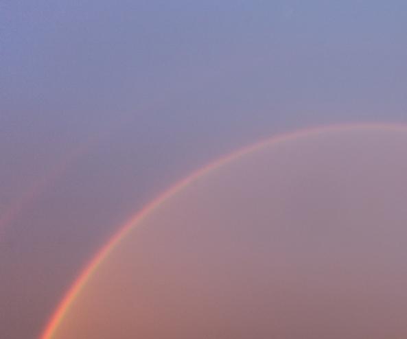 Es fängt nun auch bei mir an leise und fein zu regnen... und ganz langsam zeichnet sich direkt neben dem roten "Vorhang" ein Regenbogen ab, der fast senkrecht in den Himmel zu wachsen scheint...zuerst nur in rot und ganz wenig gelb, doch er wird von Sekunde zu Sekunde deutlicher, kräftiger und auch farbiger.... So steil in den Himmel hab ich noch nie einen Regenbogen wachsen gesehen, erst jetzt erkenne ich, dass es sich um die "linke" Seite des Regenbogen handelt, dann für wenige Sekunden sehe ich den ganzen Regenbogen (und auch einen Teil des "zweiten" Regenbogens).. in den Regenbogenfarben aber mit extremen Rotstich... und auch extrem steil und hoch in den Himmel, ich denke das lag daran, dass die Sonne erst am aufgehen war + Morgenrot)