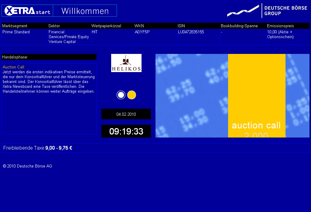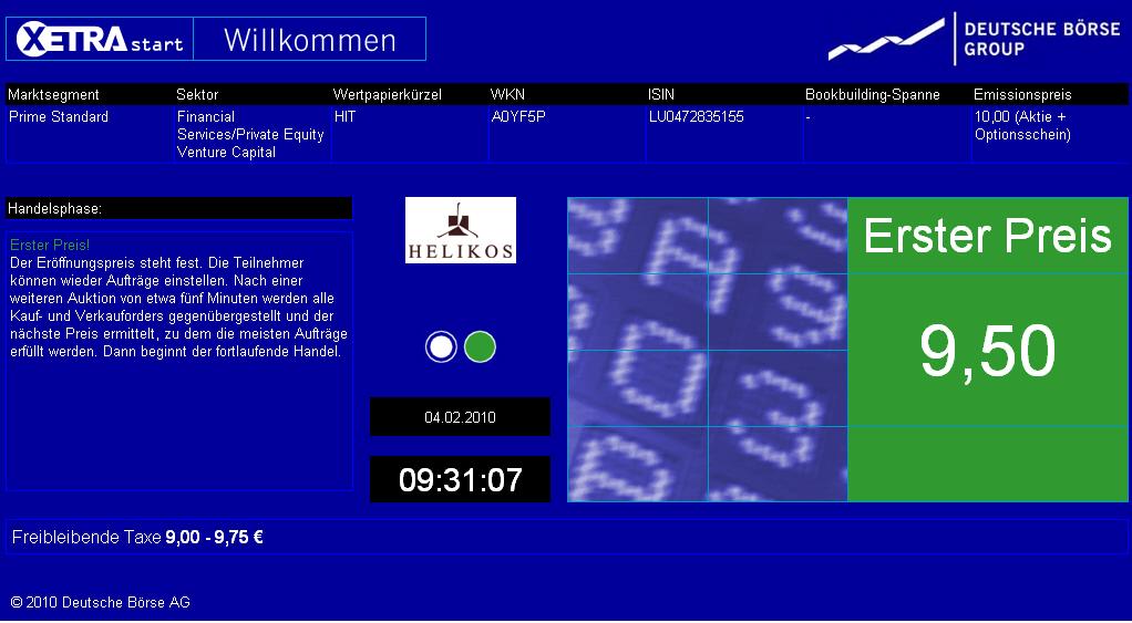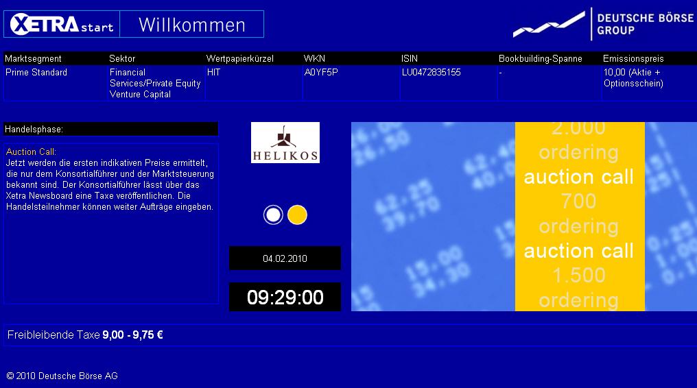 Die endgültige Angebotsgröße wird 20 Mio. Anteile betragen zum Preis von jeweils 10,00 EUR je Anteil. Jeder Anteil besteht aus einer Aktie der Gattung A ('Publikums-Aktie') und einem Optionsschein der Gattung A ('Publikums-Optionsschein') auf eine Publikums-Aktie. Der Publikums-Optionsschein wird einen Ausübungspreis von 9,00 EUR haben und kann nur 'bargeldlos' ausgeübt werden. Die Publikums-Aktien und Publikums-Optionsscheine werden an der Frankfurter Wertpapierbörse unter den Kürzeln HIT bzw. HIT1 notieren. Der Handelsbeginn für die Publikums-Aktien und Publikums-Optionsscheine wird für den 4. Februar 2010 erwartet.