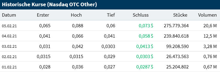 1. Feb. 0,064€, Kurs 5. Feb. 0,0623€.