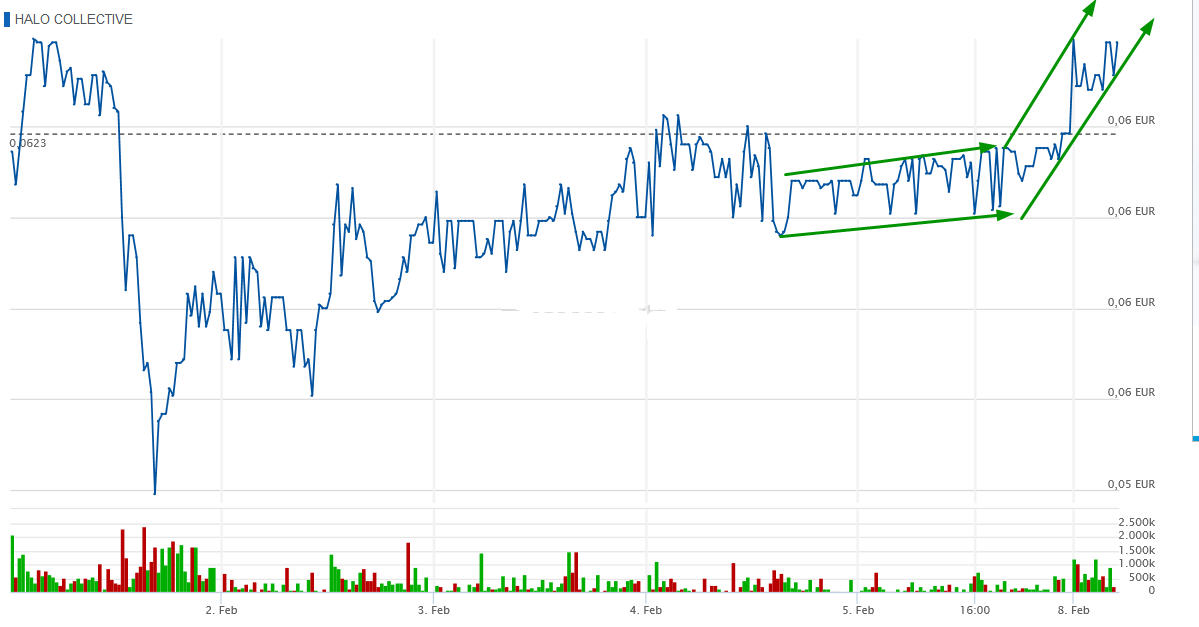Der Kurs von Halo ist selbst heute im Sonntagshandel um 5 Prozent auf 6, 5 Cent gestiegen.