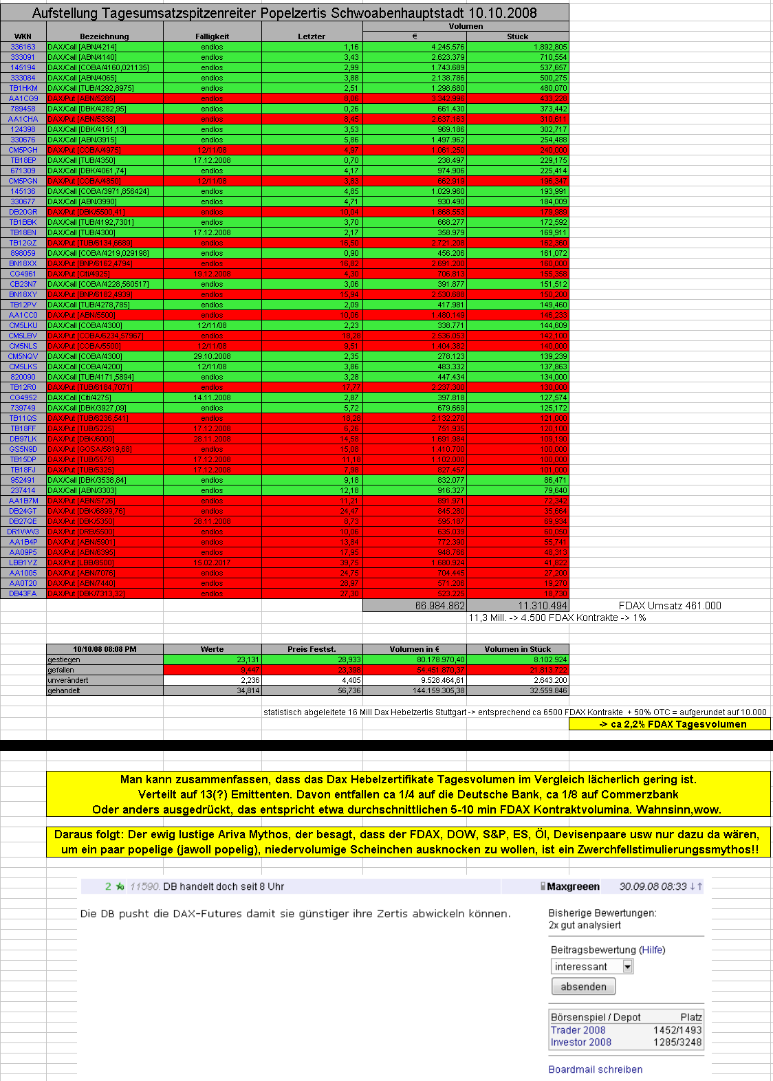 Kennst du die Tagesumsätze im Vergleich zum FDAX? Ein paar zweistellige Milliönchen... für so manchen Aktienexperten ist das sicher viel Geld. Nur, in Märkten mit Tagesumsätzen im Milliarden- und Billionenbereich ziemlich unbedeutend, geradezu lächerlich.