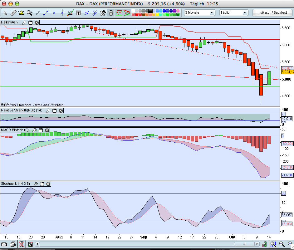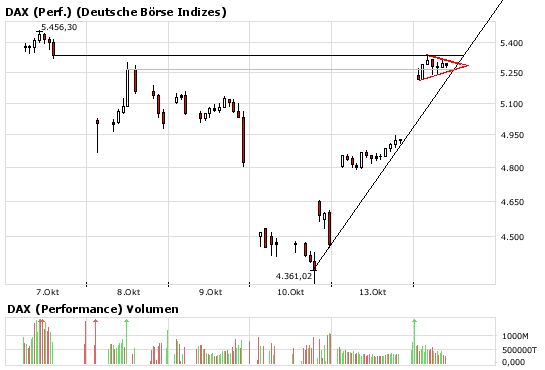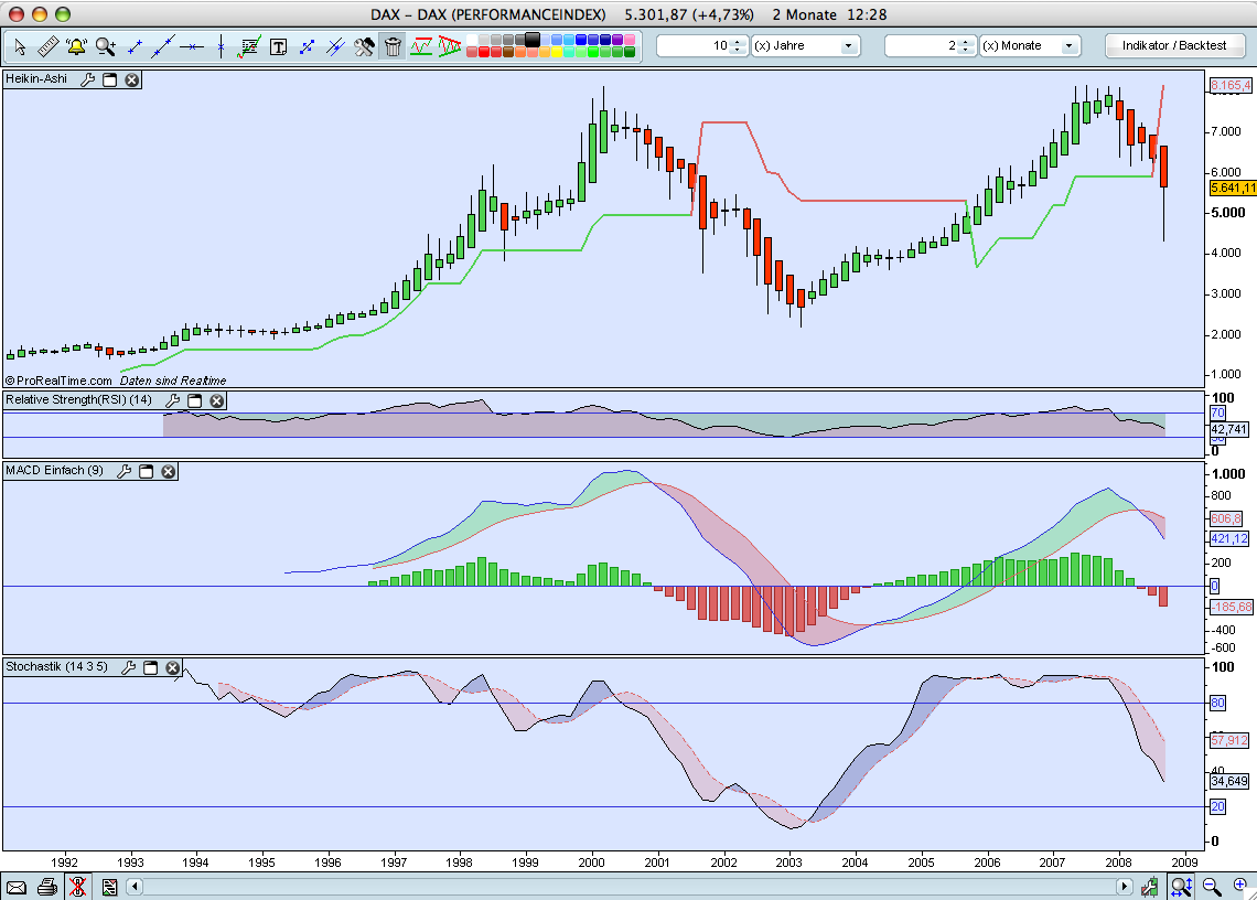 man schön beobachten das der Verkaufswille bei diesen Kursen noch nicht sehr hoch ist. Ich rechne mit einem stärkeren Abverkauf ab frühenstens ca 5400/5500 (unterer Trendkanal wie in Trüffels Chart zu sehen).Auch gehe ich beim DOW von einem Test der 10000er Marke aus die bei ereichen dann in einen Abverkauf führen kann.
