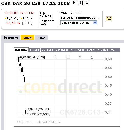 Da es ein Daxcall ist: Angstbarometer VDAX beobachten, hier auf Ariva. Der wird fallen wenn die Kurse steigen, d.h. den Call wird bestenfalls seitwärts laufen. Dafür ist der Call auch letzte Woche nicht so stark gefallen wie eigentlich "verdient". Ist also gerecht, das ganze. Puts werden übrigens dadurch doppelt wertlos, wenn der Markt jetzt steigt. Wer jetzt Put-OS hat sollte sie also verkaufen, selbst wenn er mit weiter fallenden Kursen rechnet.