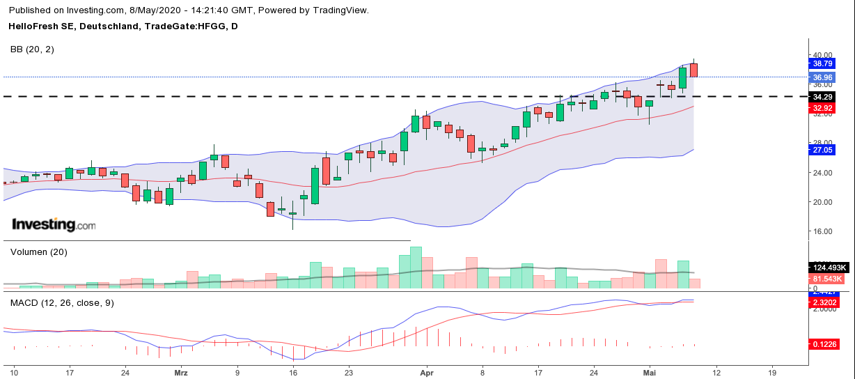 HelloFresh schon stark gelaufen, uiuiui. Was solls? Uns freut's. Über €34.5 auch kurzfristig alles im grünen Bereich. Nächstes Wochenziel €39-40.