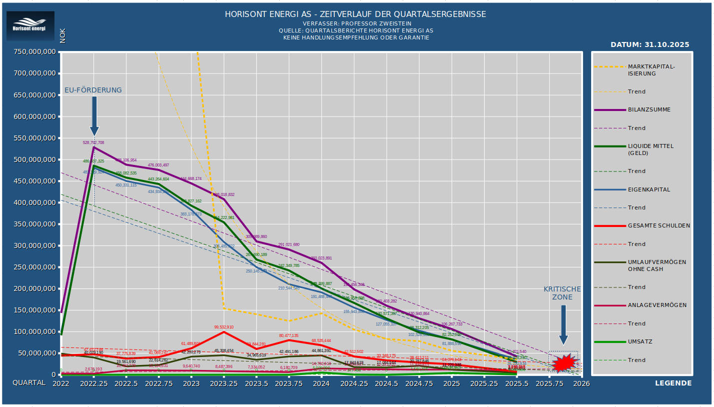 Rein von den Zahlen her macht es aber keinen Unterschied. Alle Werte gehen runter. Die angekündigte Cash-Burn-Rate dürfte die Mittel von Horizont Energi AS in den nächsten vier Monaten verzehren. Erst dann kommen die neuen Zahlen. Der CEO wurde kurzerhand ausgetauscht und gegen eine Frau ersetzt, die zunächst einmal wie eine harmlose Kartoffelverkäuferin aussieht. Allerdings sagt das ja nichts über eine Qualifikation aus. Dennoch wird sich in den nächsten vier Monaten entscheiden, wie es hier weitergeht. Ohne Geld kommen die definitiv nicht durch. Das gesamte Ding besteht umgerechnet nur noch aus etwa 4 Millionen Euro Eigenkapital. Dabei hatte die EU das Ding mit etwa 40 Millionen Euro subventioniert. Was wurde damit gemacht? Nichts ... Aber für die paar Mitarbeiter war das sicher richtig angenehm da. Die hatten schön ihre Gehälter und ein lockeres Leben. Ich kann mir nicht vorstellen, dass die EU hier nochmal Fördermittel bereitstellt. Die müssten vollkommen blind sein. Ich werde mich selber hüten, in sowas zu investieren ...