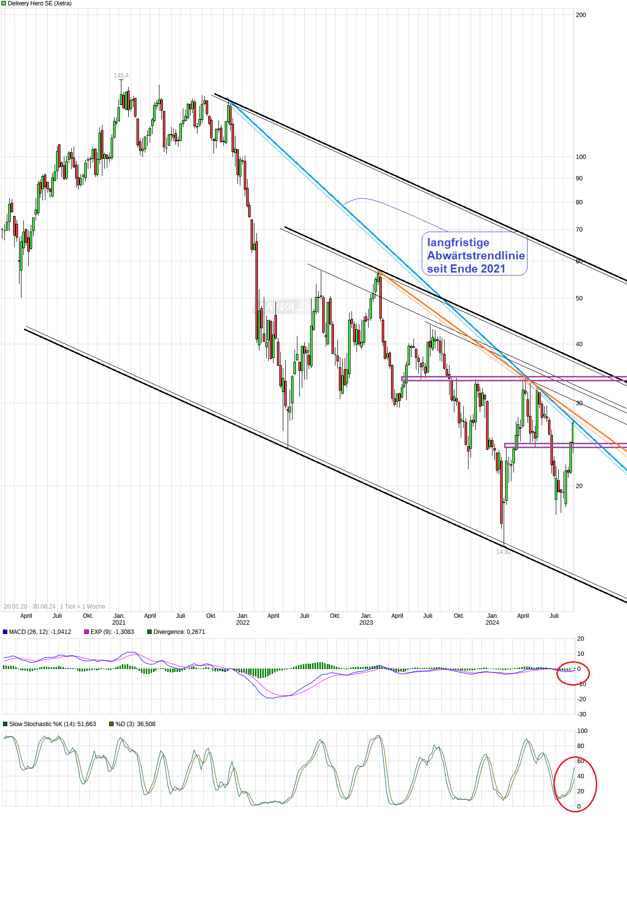 Heute klopft der Kurs an der langfristigen blauen Abwärtstrendlinie an. Wäre schön man könnte den Schwung nach den Zahlen nutzen, um dort durchzulaufen.